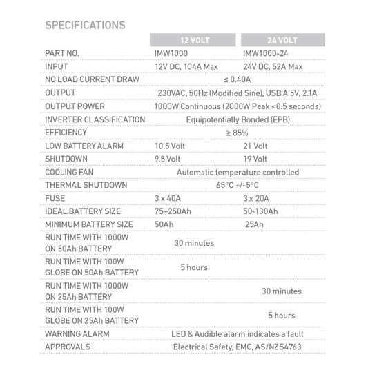 Vendor:IMW1000-24Inverter, Modified Sine Wave Inverter, 24v, 1000w - EachRegular price $322.00 (+10% GST)Regular priceUnit price / per-