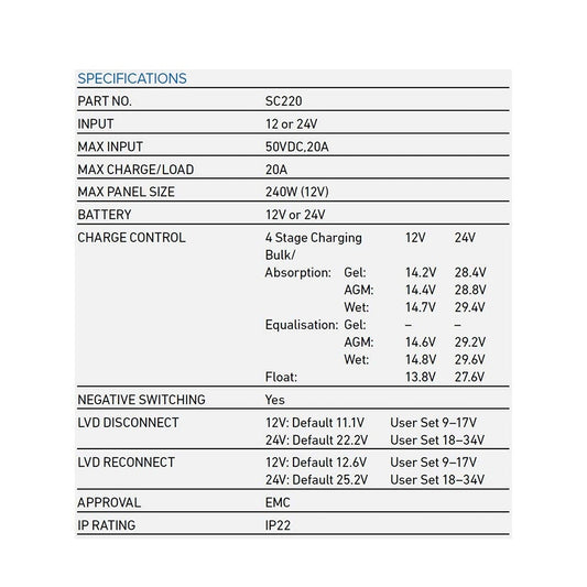 Solar Charge Controller, Projecta, 3 Stage Automatic, Remote Meter, 12/24v, 20a - Each