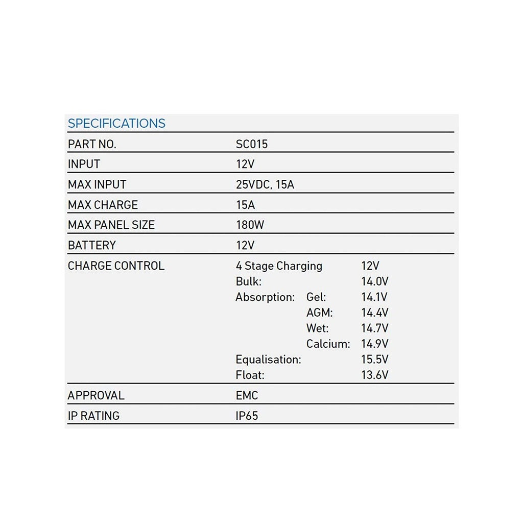 A compact controller suitable for solar panels producing up to 15 Amps. Utilising an advanced 4 stage charging profile, this controller ensures both starting and deep cycle batteries are kept in peak condition.