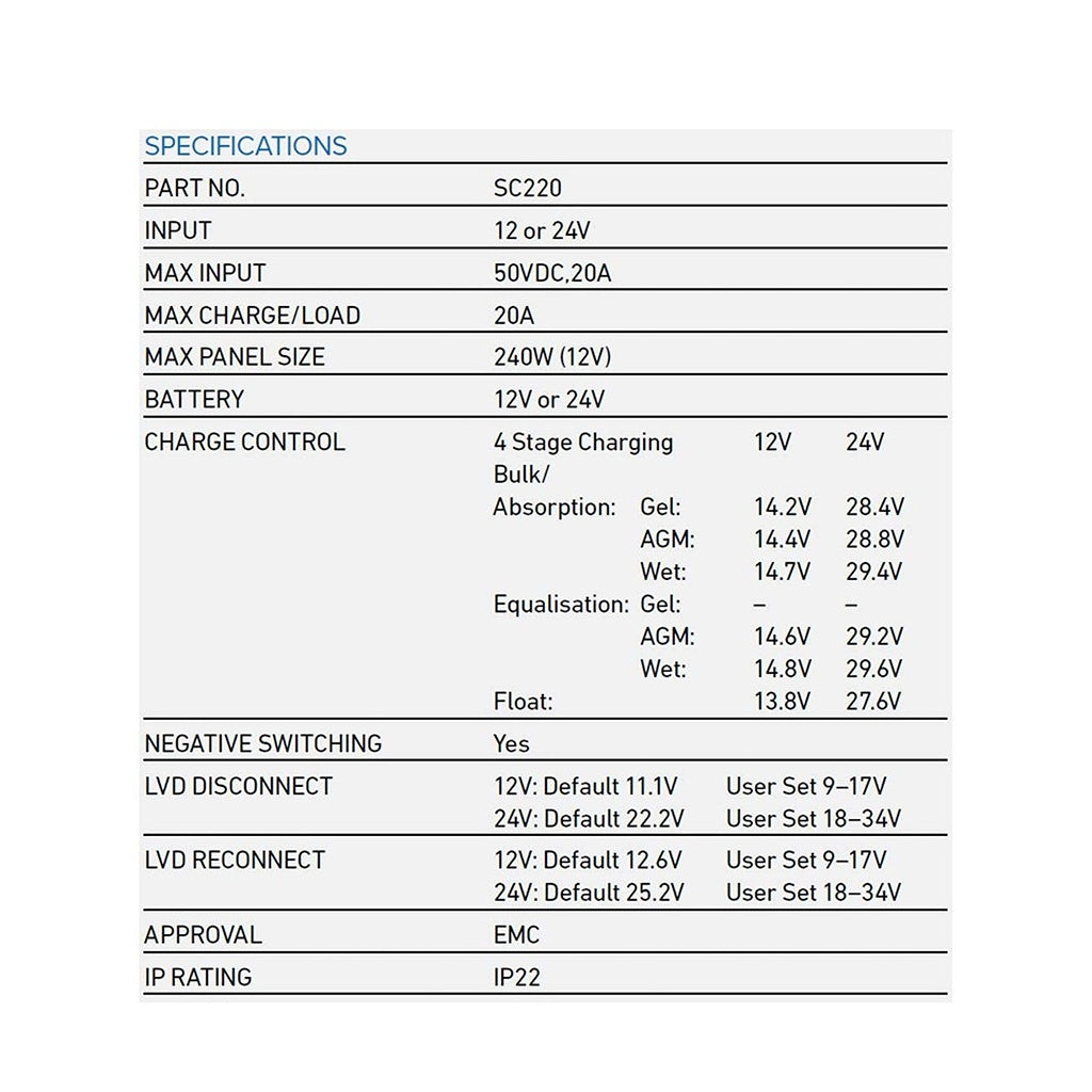 Ideally suited to solar panels producing up to 20 Amps, the SC220 is a sophisticated solar controller that delivers a comprehensive 4 stage charging process and the ability to tailor its settings to best suit your battery type.